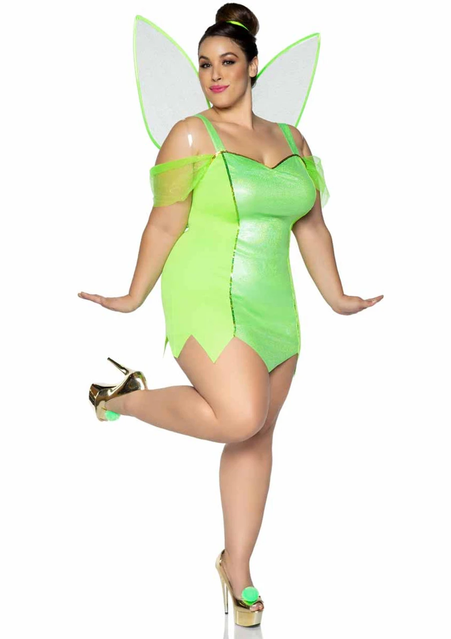 Pretty Pixie Plus Size Fairy Costume includes sequin trimmed dress, fairy wings, hair ribbon, and shoe pom poms.