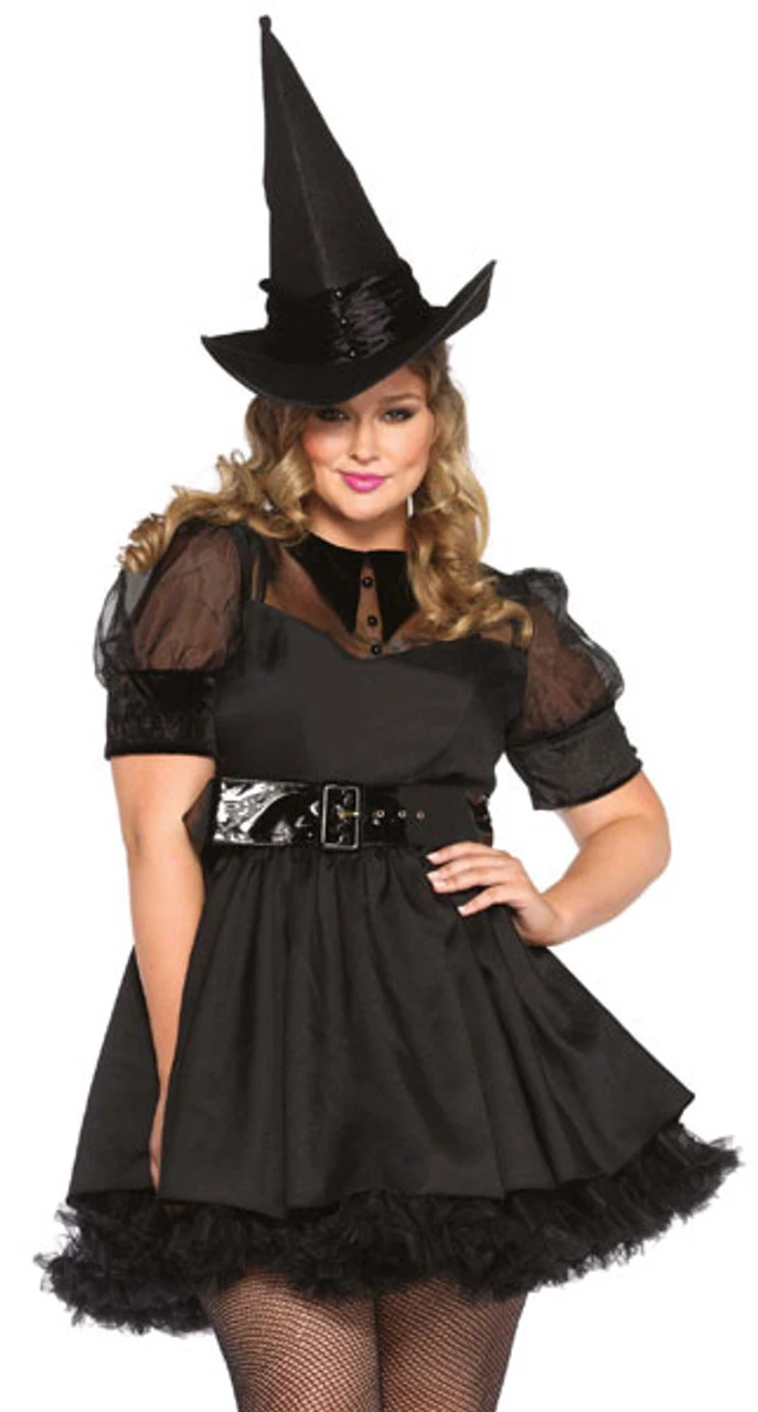 3pc Bewitching Witch costume includes, vintage inspired dress with organza and velvet collared bodice, wide belt, and matching hat.