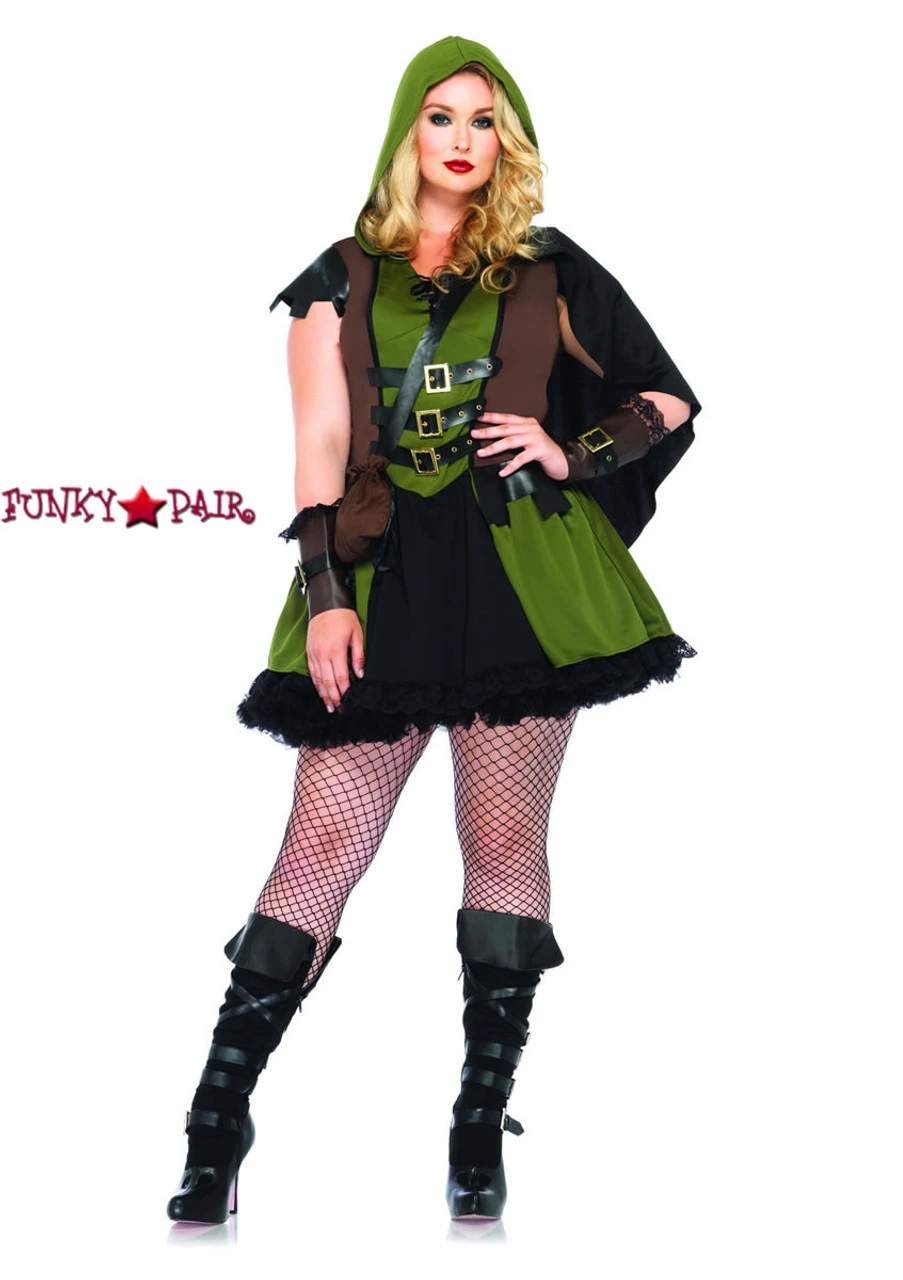 3 PC. Darling Robin Hood Plus Size Costume, includes dress with one shoulder cape, arm cuffs, and cross body money bag. (Petticoat, and Hosiery sold separately)