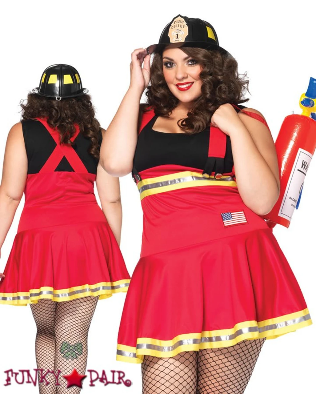 Three Alarm Hottie costume, features suspender dress with metallic trim and flag applique