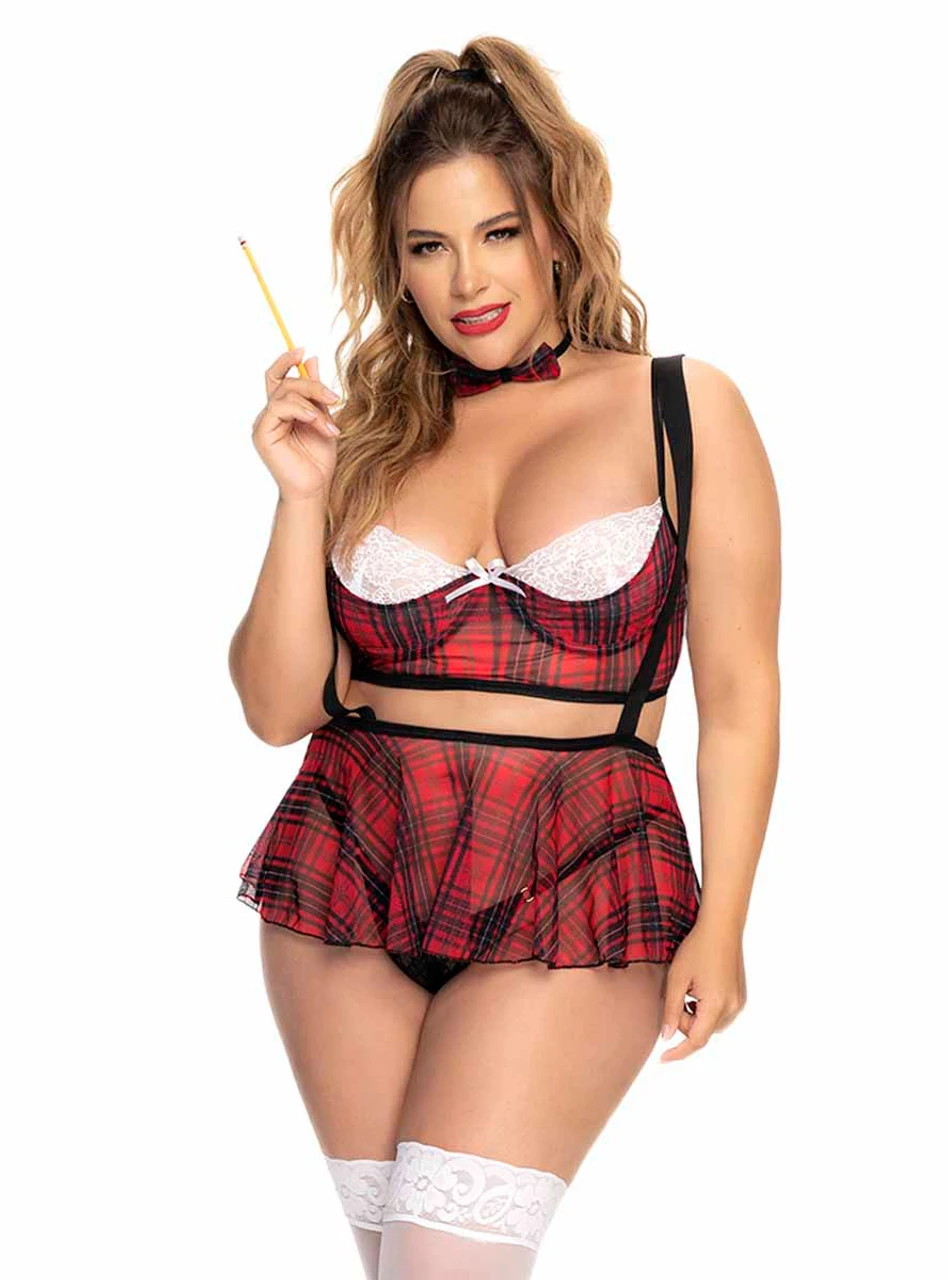 4PC Plus Size Sexy schoolgirl includes underwire top and adjustable straps, skirt with suspenders, thong and bowtie.