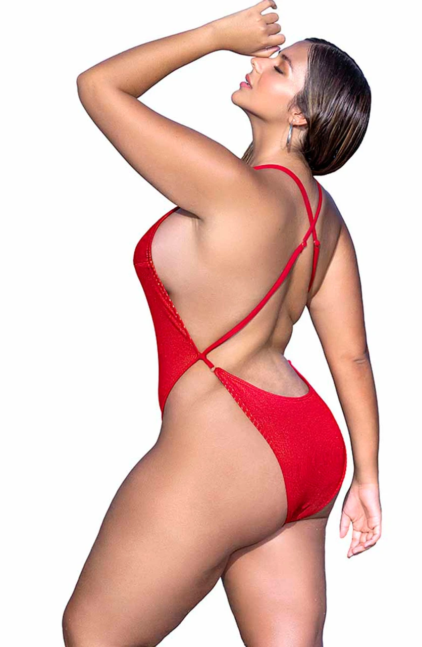 Plus Size Shimmery ribbed one-piece bodysuit: high leg cut with deep v-neck and open back, adjustable straps, minimal coverage.