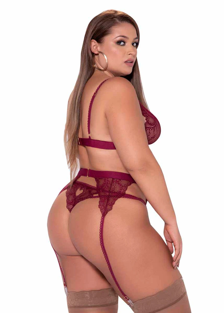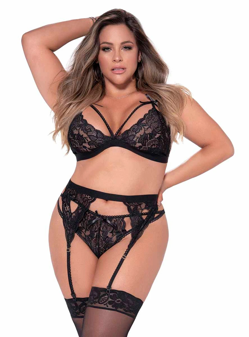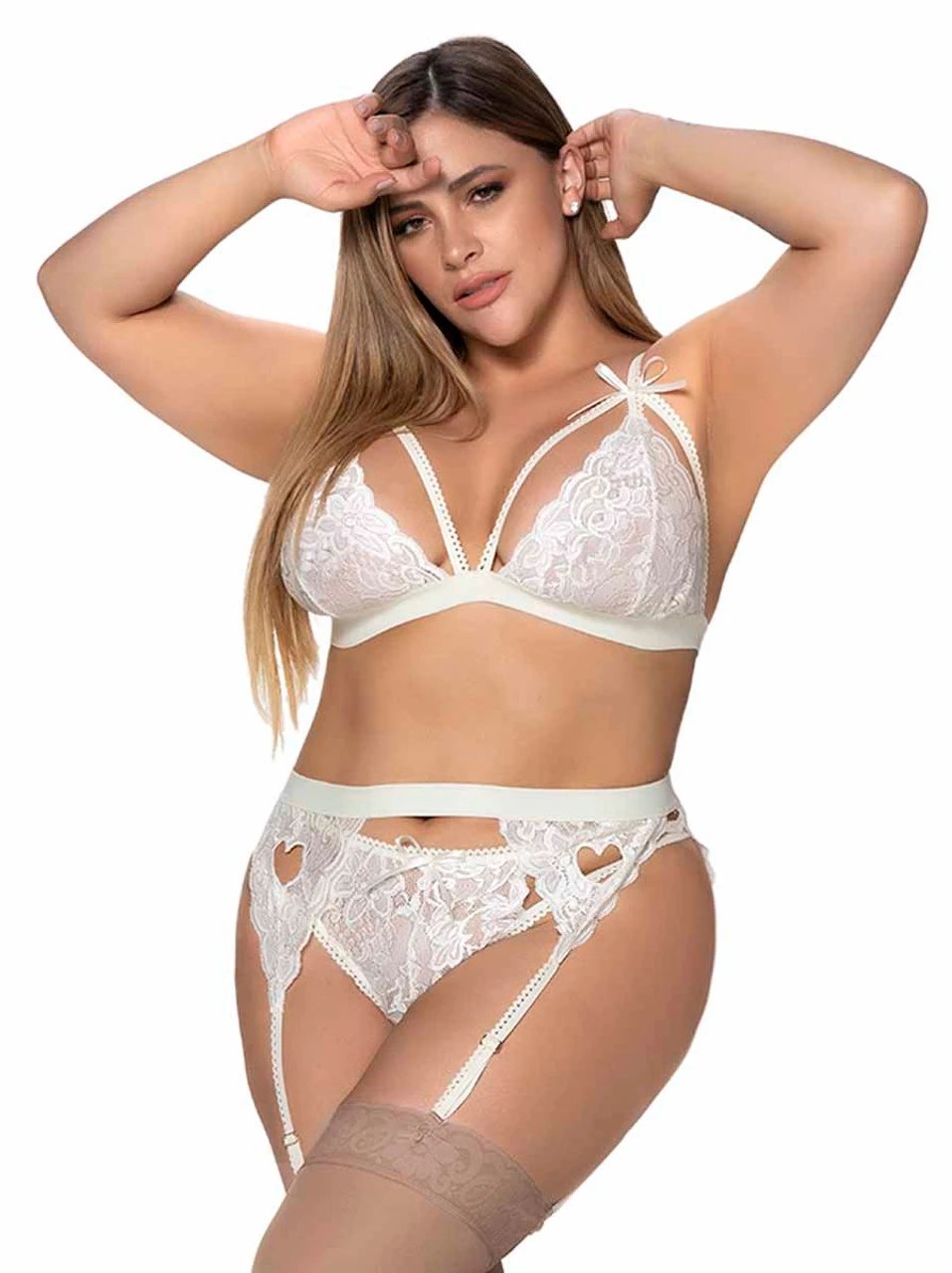 3pc lace set features a bra, thong, and garter belt. Garter and thong feature sexy heart designs perfect for a romantic occasion. The top has decorative bows, adjustable straps and a clip in the back.