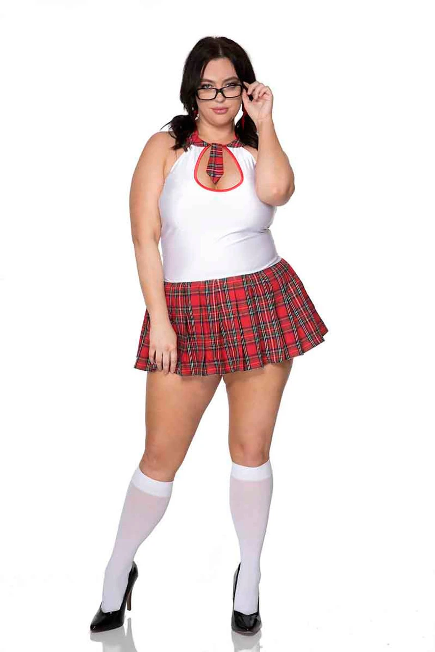 3 PC. includes: Plus size white top with red plaid skirt, red plaid neck tie and red ribbon. ( Glasses and hosiery not included)