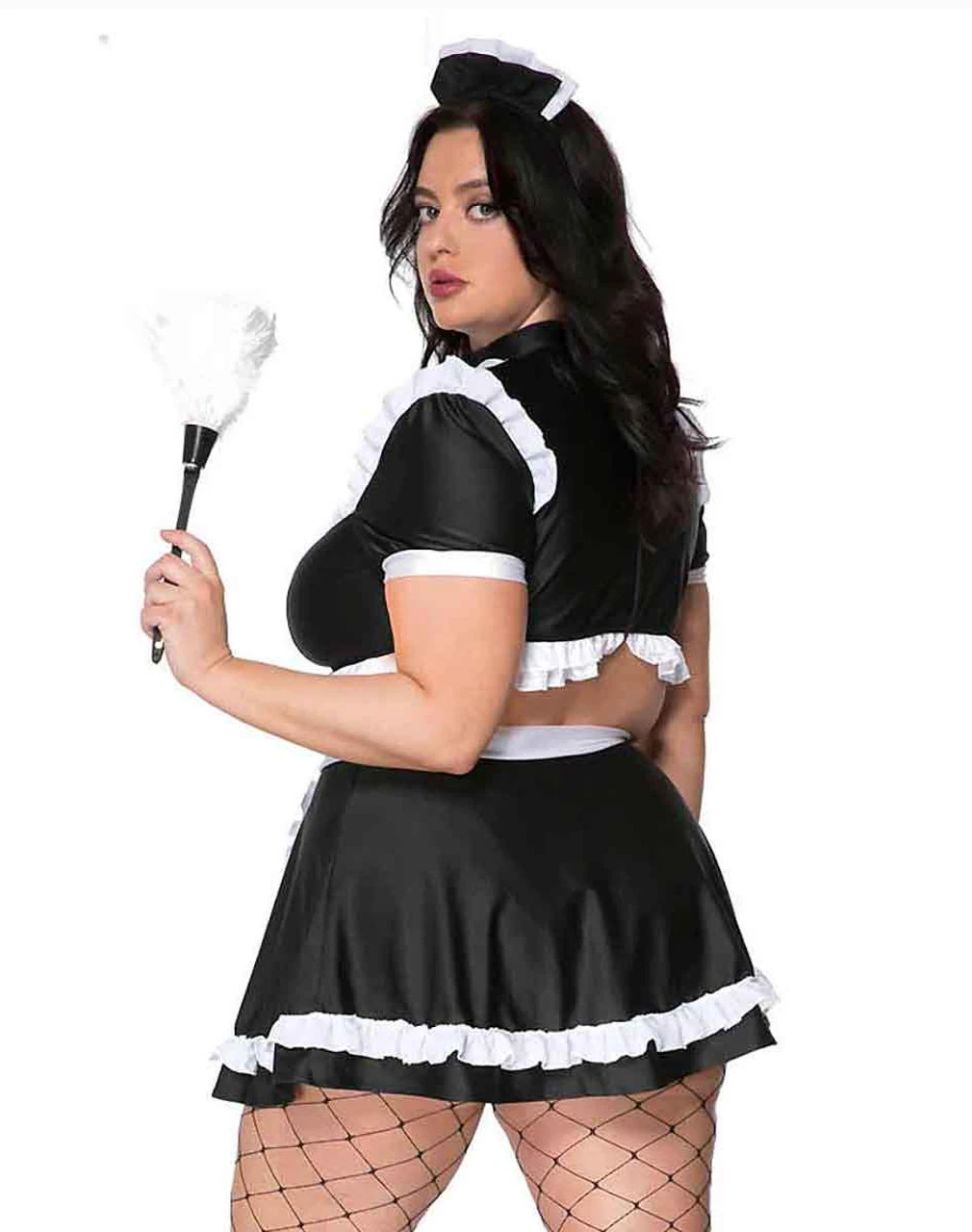 4 PC. includes: Plus Size Lace trimming, a lace-up front with choker, attached apron and the lacy skirt, feather duster, and headpiece