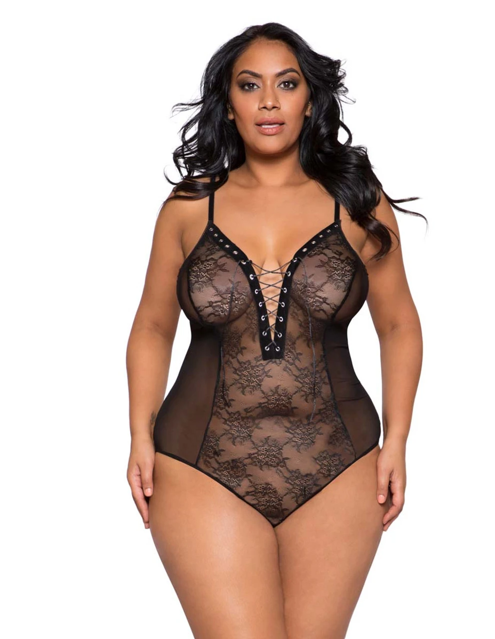 Plus Size Lingerie | LI281X, Sheer lace and mesh bodysuit with lace-up detail and snap bottom