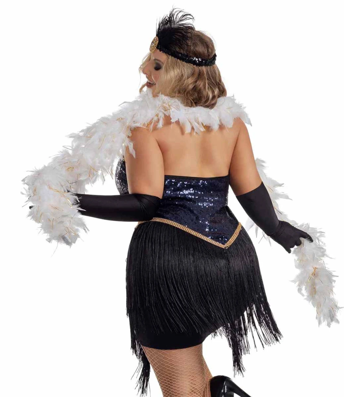 Navy blue stretch sequin fitted dress with fringed skirt, faux gold diamond accents through out, matching headpiece, and gloves. Fishnet tights (SH001) sold seperately. Feather boa and pearl necklace not included.