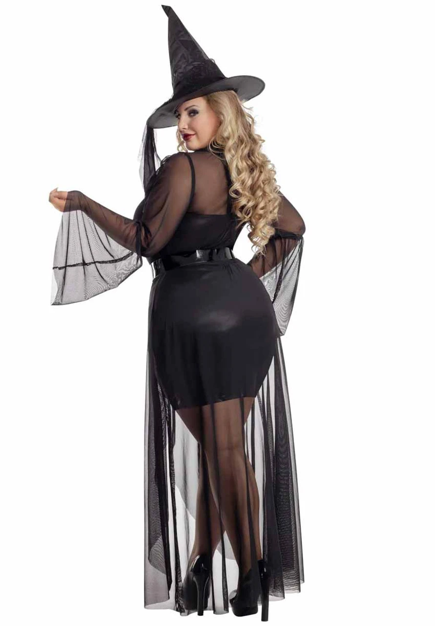 Black bodycon under dress with pentagram neck detail, with black sheer flared and ruffle collar over dress, witches hat, and patent leather belt with skulls and voodoo doll detail.