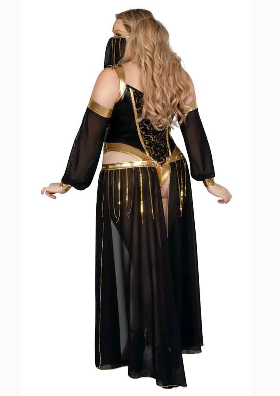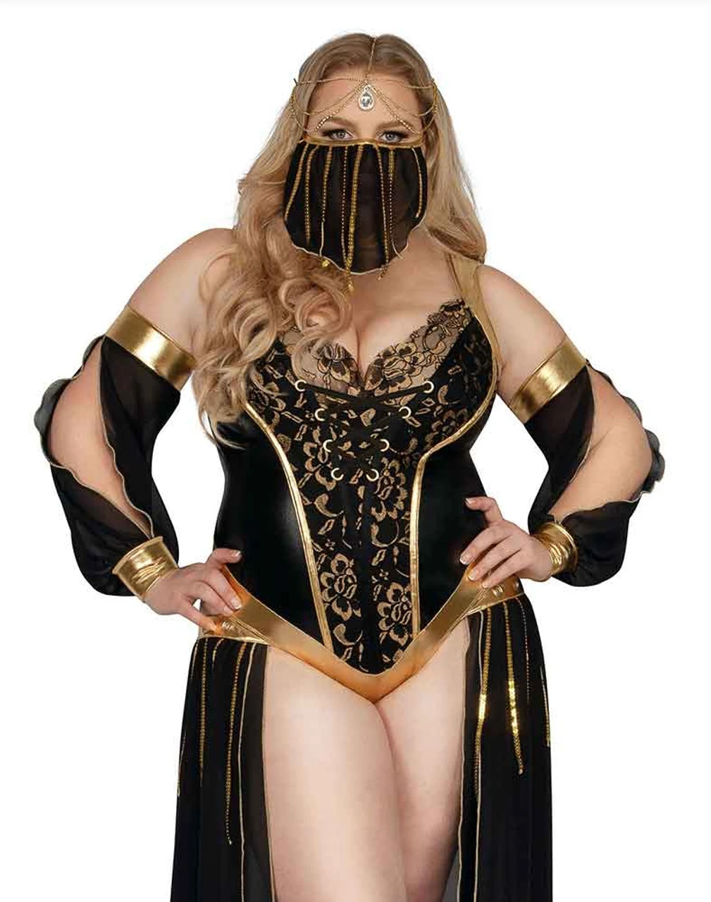 Plus Size Dark Harem Nights Costume Includes: black wet look spandex teddy with black and gold lace details throughout. Chiffon train attached to gold leg straps with grommets detail and clasps at back. Includes separate tulip sleeves, chiffon mask, choker, and rhinestone chain crown.