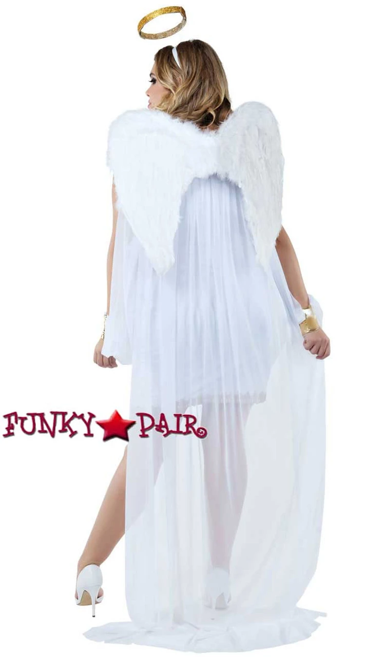 Angel Costume includes a fitted spandex dress with gold lace trim neck and hem, sheer mesh train and bellow sleeve detail attached to gold cuff, gold waist belt with faux rhinestone halo, and feather angel wings.