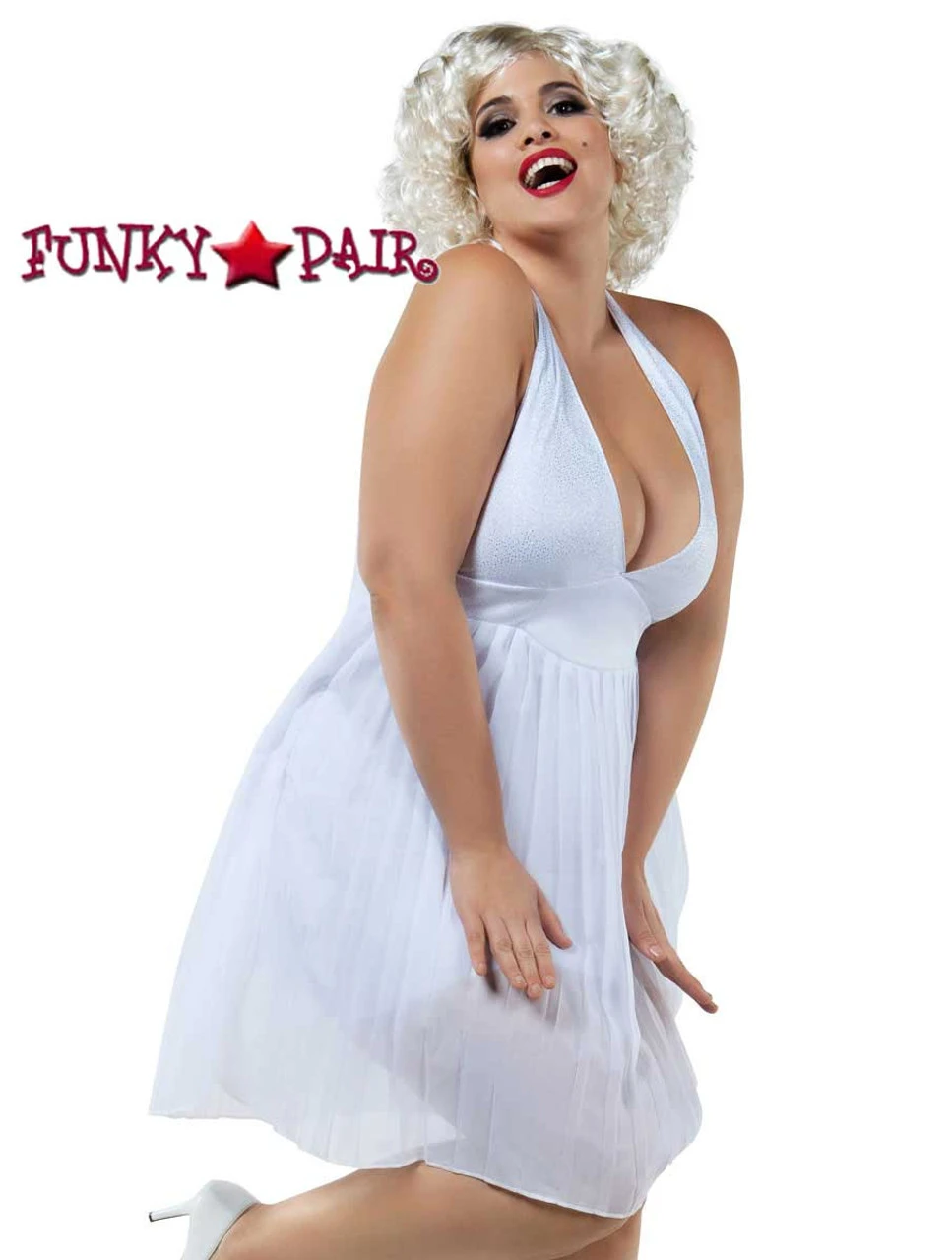 Blonde Bombshell Girl Costume includes a white silver sparkle halter dress with pleated sheer outer skirt. Wig (W8027) sold separately.