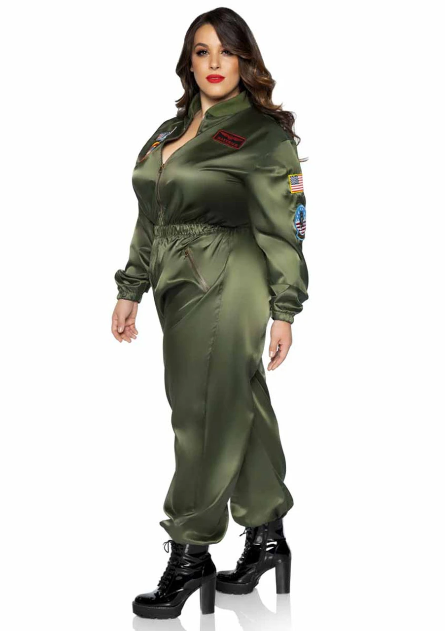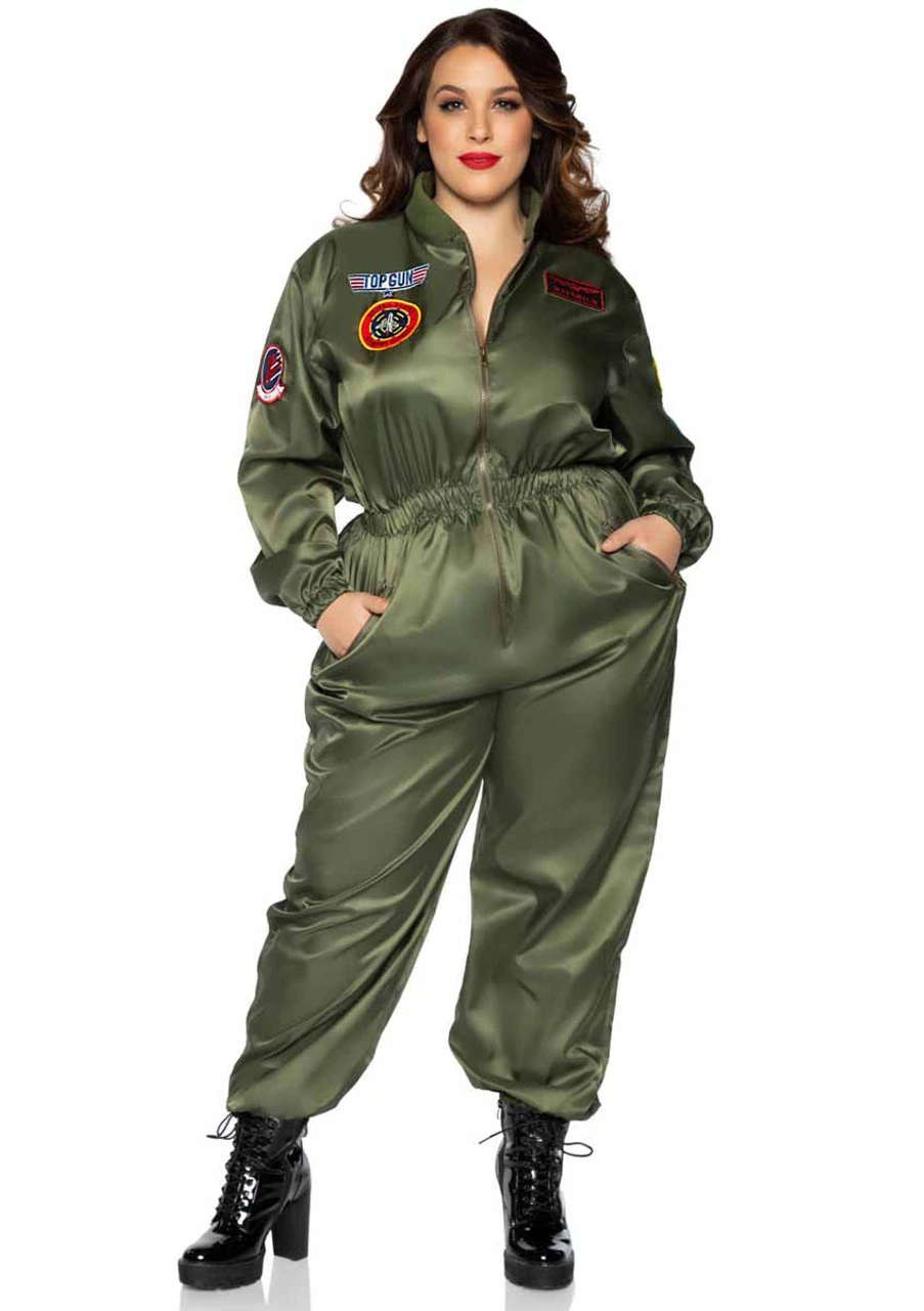 Top Gun Women Plus Size Parachute Flight Suit features zip up nylon jumpsuit with interchangeable Maverick and Goose name badges.